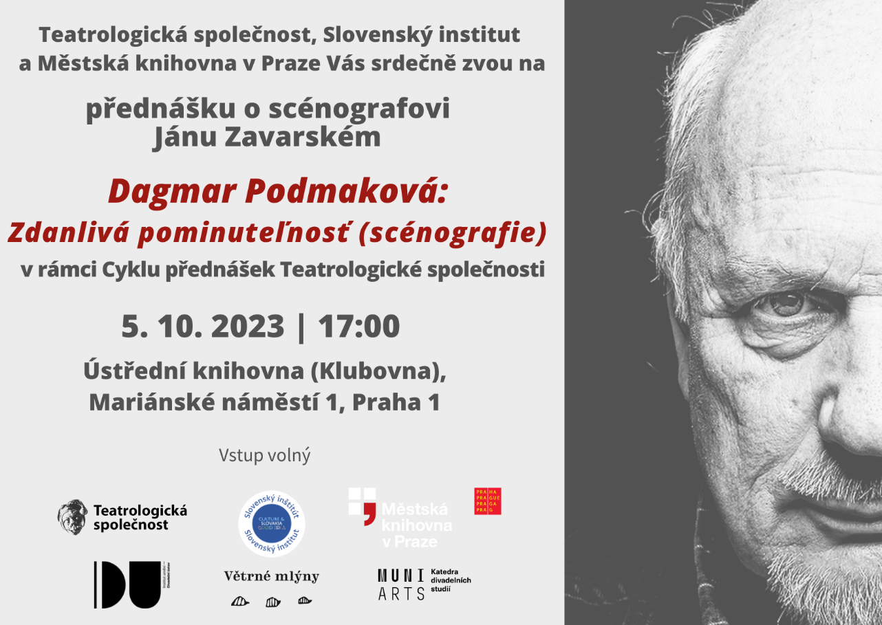 dovoľujeme si Vás pozvať na prednášku s názvom „Zdanlivá pominuteľnosť (scénografia)“, v rámci ktorej teatrologička PhDr. Dagmar Podmaková, CSc. predstaví myslenie a rukopis významného slovenského scénografa Jána Zavarského (1948-2022). Súčasťou prednášky bude prezentácia odbornej publikácie Ján Zavarský, ktorú vydalo české nakladateľstvo Větrné mlýny. Prednáška sa uskutoční dňa 5. 10. 2023 o 17:00 v Mestskej knižnici v Prahe (Mariánské náměstí 1, Praha 1).
