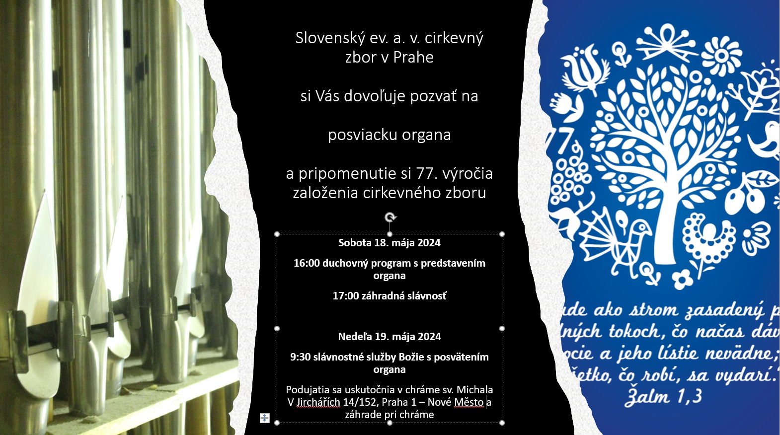 Dovoľujem si Vás pozvať na naše zborové slávnosti v dňoch 18. a 19. mája 2024. V týchto dňoch si pripomenieme 77. rokov pôsobenia Slovenského ev. a. v. cirkevného zboru v Prahe a po ukončení prác na organe ho na slávnostných službách Božích posvätíme k užívaniu v chráme Božom. Tešíme sa na stretnutie s Vami.