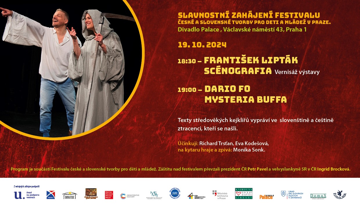 Srdečne pozývame na slávnostné otvorenie Festivalu českej a slovenskej tvorby pre deti a mládež v Prahe 19. 10. 2024 o 18:30 h. do Divadla Palace .