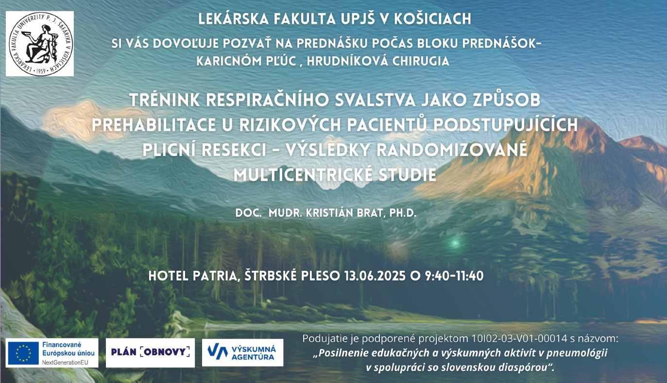 Blok prednášok karcinóm pľúc a hrudníková chirurgia, prednáška doc. MUDr. Brat, Ph.D. s názvom: Trénink respiračního svalstva jako způsob prehabilitace u rizikových pacientů podstupujících plicní resekci - výPsledky randomizované multicentrické studie. Blok prednášok sa uskutoční 13. 06.2025 v čase od 9:40 do 11:40.
