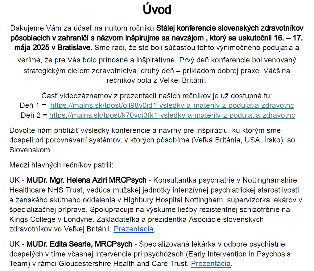 Dovoľte nám priblížiť výsledky nultého ročníka Stálej konferencie slovenských zdravotníkov pôsobiacich v zahraničí s názvom Inšpirujme sa navzájom, ktorý sa uskutočnil 16. – 17. mája 2025 v Bratislave, a návrhy pre inšpiráciu, ku ktorým sme dospeli pri porovnávaní systémov, v ktorých pôsobíme (Veľká Británia, USA, Írsko) so Slovenskom.