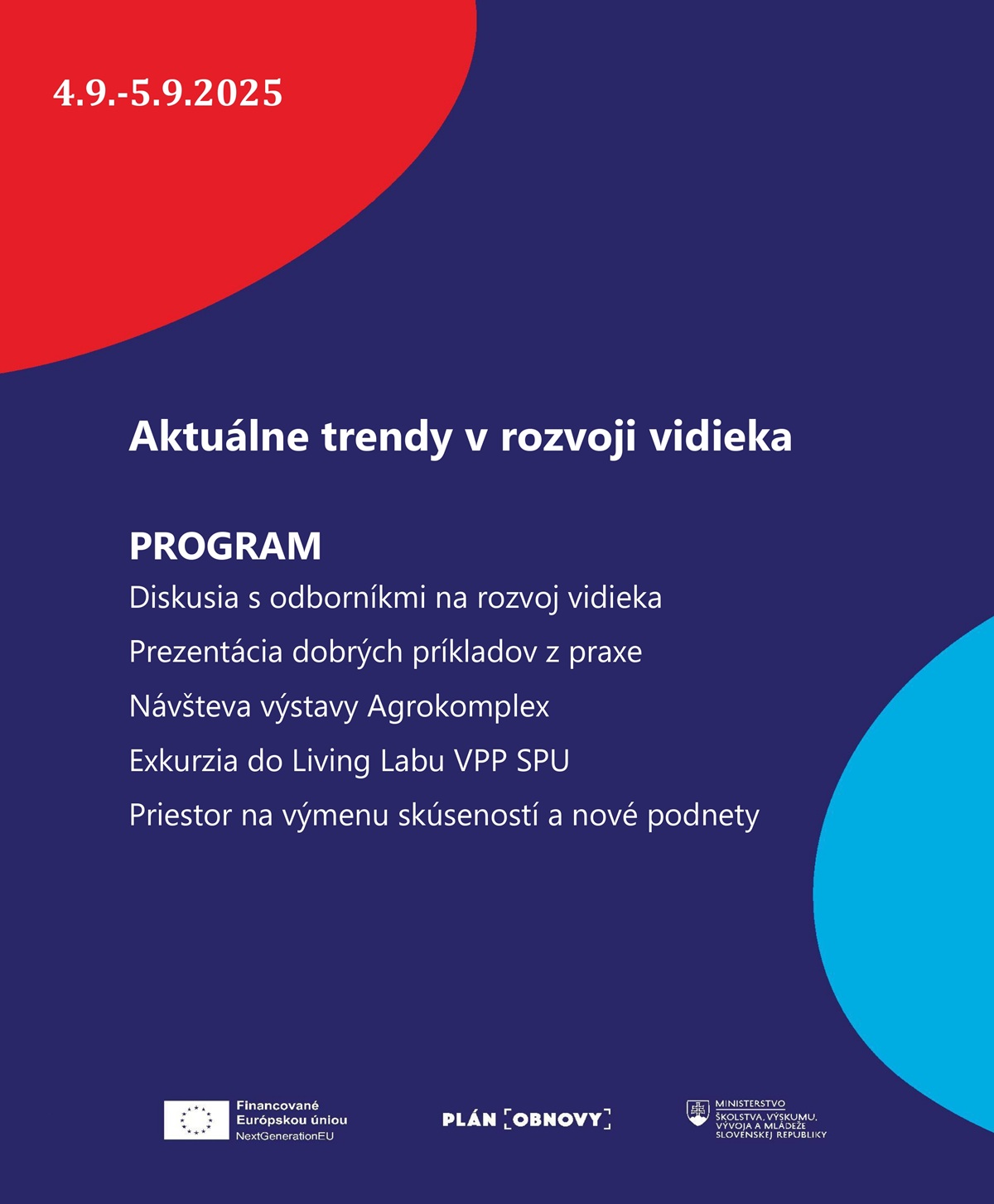 Cieľom 2-dňového programu je diskutovať aktuálne trendy rozvoja vidieka s expertmi z vysokých škôl. V rámci programu budú prezentované dobré príklady z praxe. Workshopu sa zúčastnia experti vysokých škôl so zameraním na rozvoj vidieka. Súčasťou programu bude návšteva výstavy Agrokomplex a Living Lab v priestoroch Vysokoškolského poľnohospodárskeho podniku.