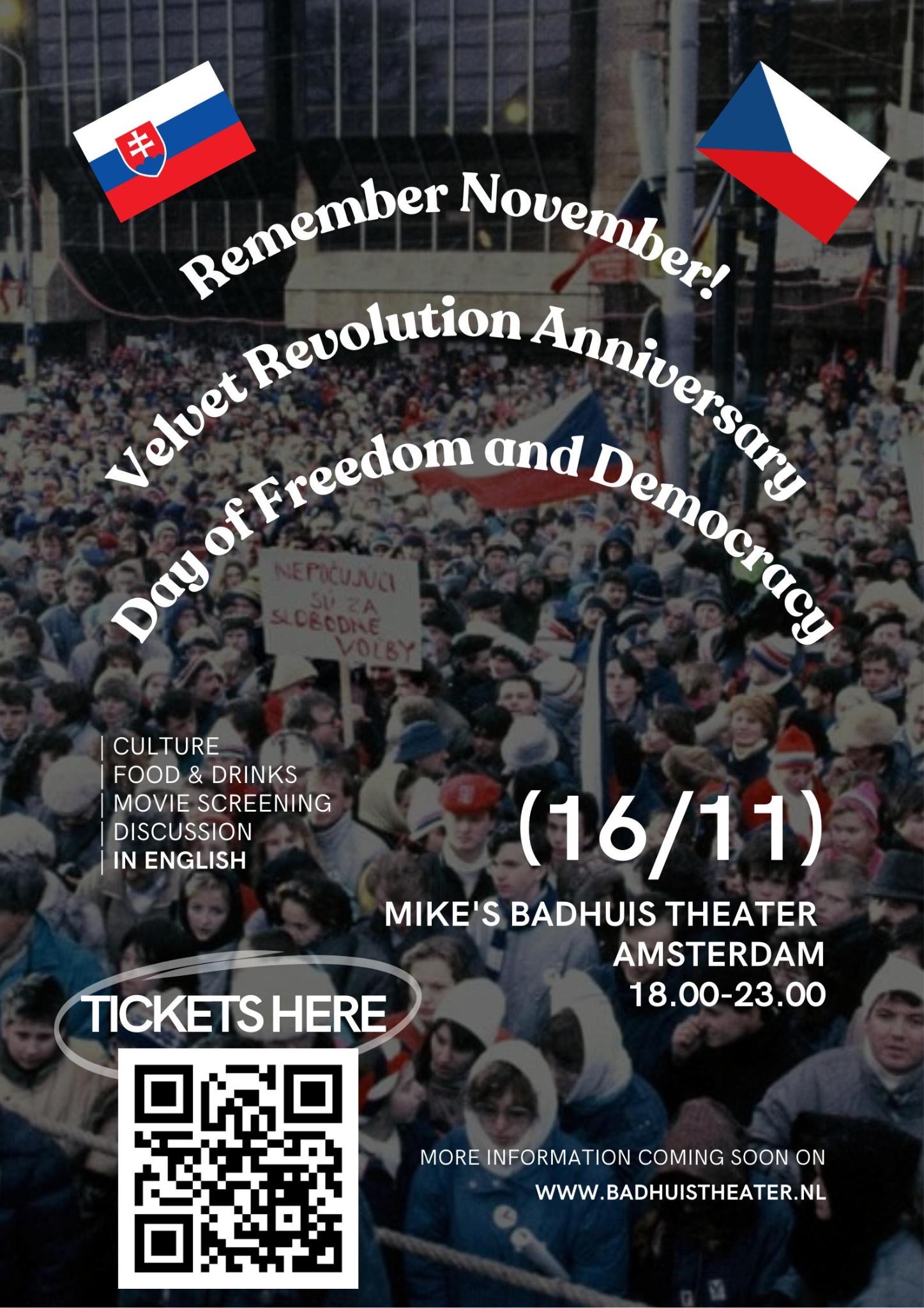 Come join us to spend a day in the Badhuistheater and celebrate the holiday with Slovak and Czech food, culture, art, and come meet fellow Slovaks, Czechs, friends, families and any plus ones! Don’t get discouraged, even though we discuss history (and combine it with fun and drinks) during the Czechoslovak Velvet Revolution, we want to open up this event to our Dutch and international friends, so the event will be held (mostly) in English.