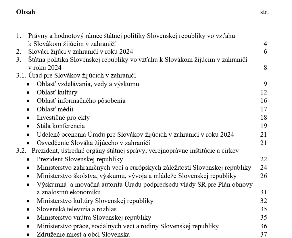 Správa za rok 2024 o štátnej politike vo vzťahu k Slovákom žijúcim v zahraničí a o poskytnutej štátnej podpore Slovákom žijúcim v zahraničí a návrh programu štátnej politiky vo vzťahu k Slovákom žijúcim v zahraničí na rok 2026.