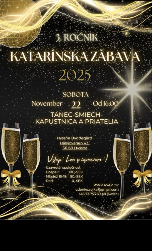 Aj tento rok naša komunita žijúca v okolí švédskeho Göteborgu organizuje tradičnú Katarínsku zábavu. Stretnutie našich krajanov z okolia Göteborgu sa uskutoční na chate Hyssna Bygdegård 22. novembra 2025 od 16:00 a zábava bude trvať pokiaľ budete vládať tancovať a nezje sa kapustnica.