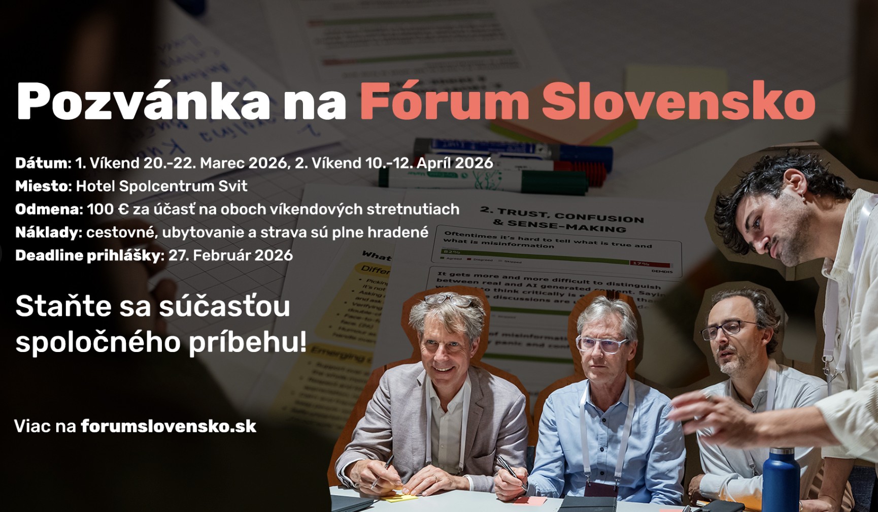 Fórum Slovensko hľadá 60 ľudí z rôznych prostredí, ktorí sa zapoja do férových a otvorených diskusií naživo o tom, ako má vyzerať bezpečné a odolné Slovensko v časoch kríz - za dôstojnú odmenu a s úhradou všetkých nákladov.