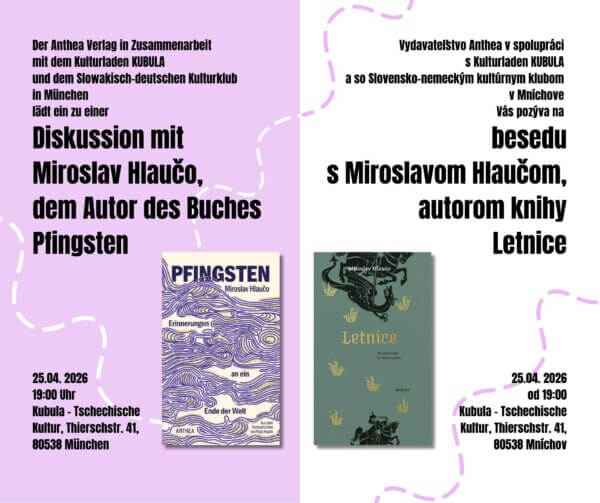 Miroslav Hlaučo pochádza z Bobrovca, no už 30 rokov žije v Prahe. Aj svoj literárny debut, román Letnice, napísal v češtine. A hneď s ním vyhral českú literárnu cenu Magnesia Litera. Vyštudoval réžiu na DAMU a filmovú vedu na Karlovej univerzite. No väčšinu života ho živí farmácia, ktorú ukončil v Bratislave. 25. apríla ho budete mať možnosť stretnúť v Mníchove. Pridajte sa k nám a zoznámte sa nielen s Miroslavom Hlaučom, ale aj s nemeckým prekladom jeho knihy.